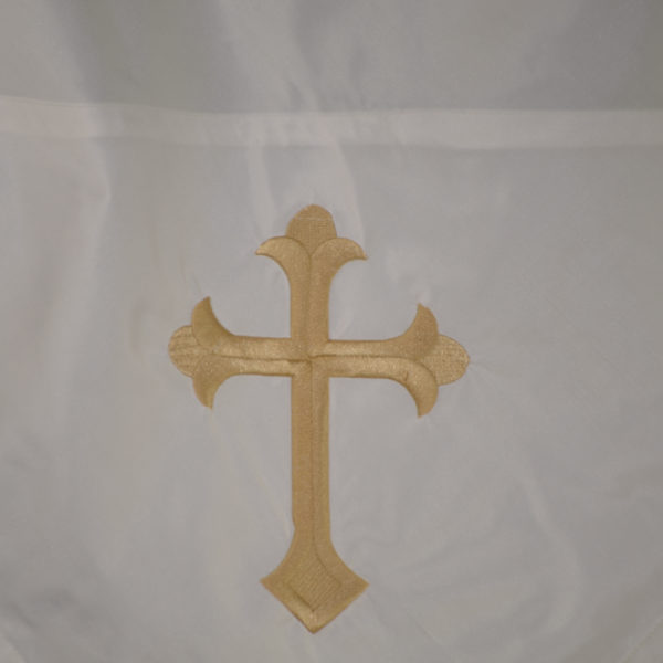 This stunning shawl is handmade using a meter square single sheet of 100% dupion silk in either Antique White or Ivory. One corner has our beautiful embroidered cross available in corresponding Cream or White (to give a subtle look) or our statement Gold or Silver. The back of the cross is hidden on the opposite side by a silk corner allowing this shawl to be gorgeous from very angle.